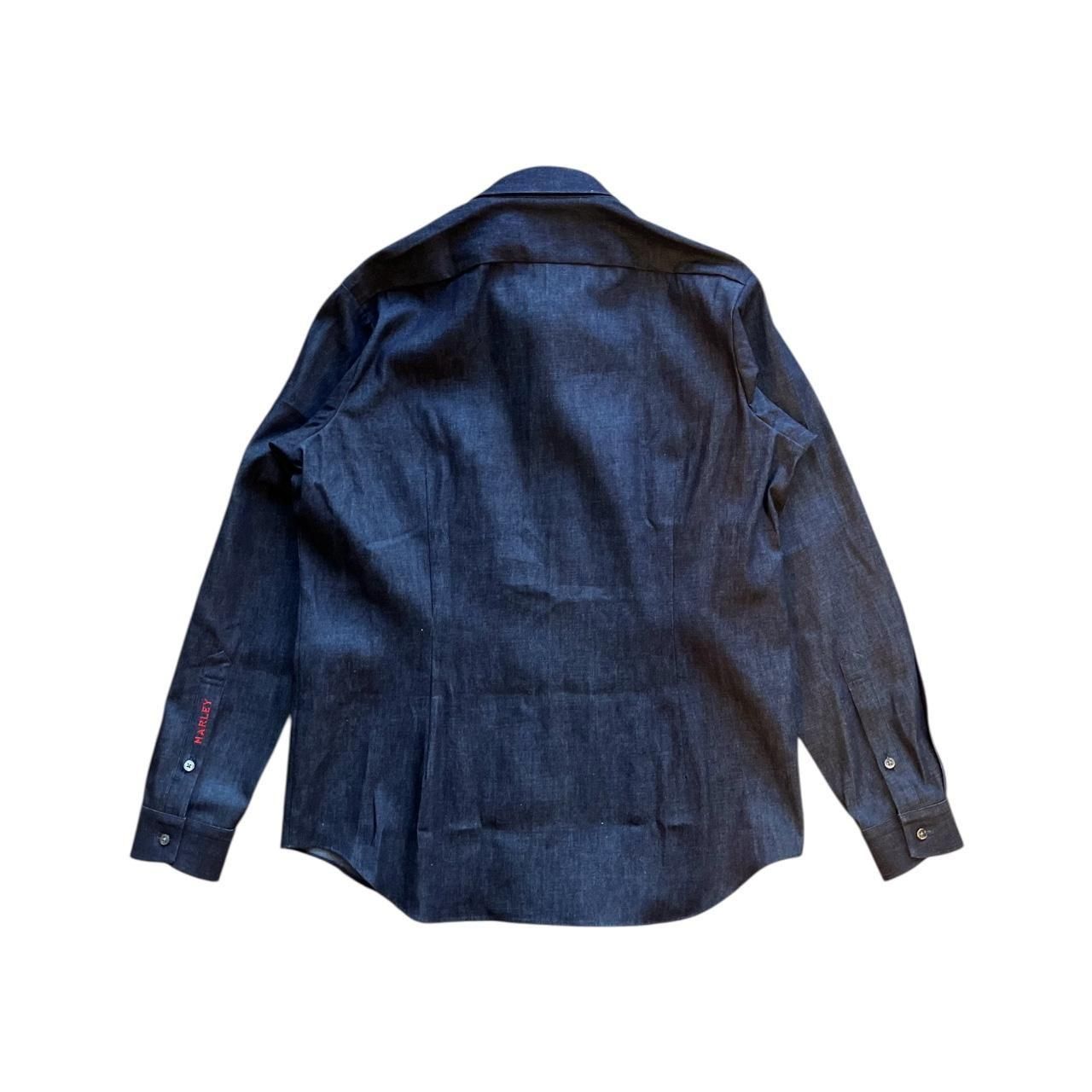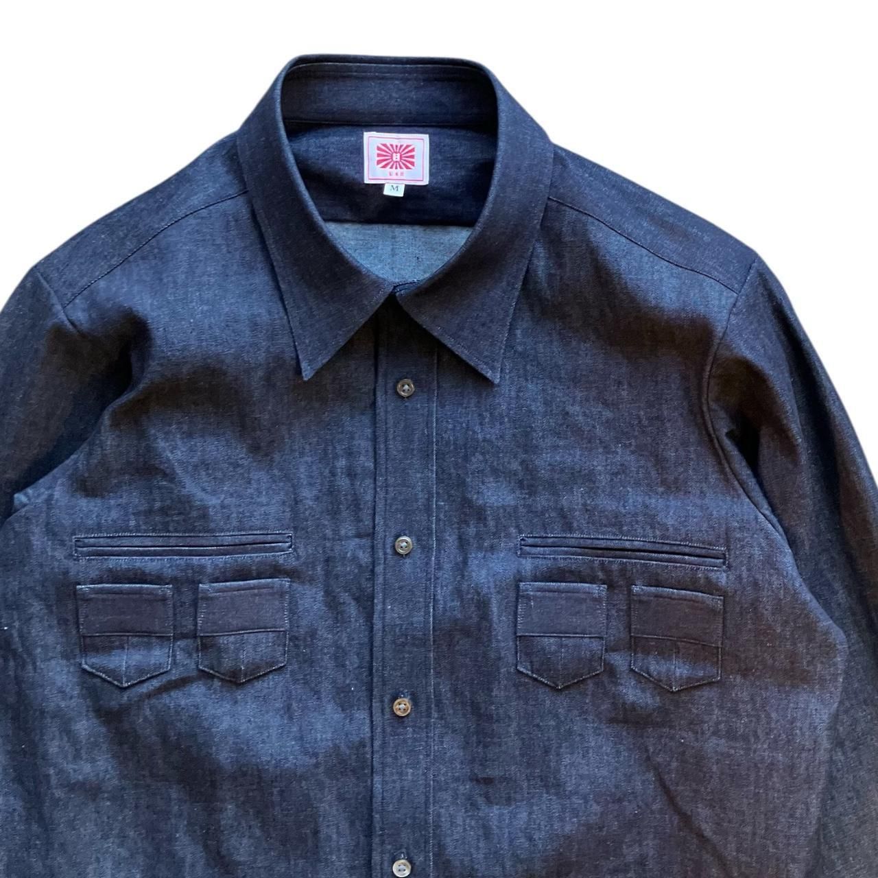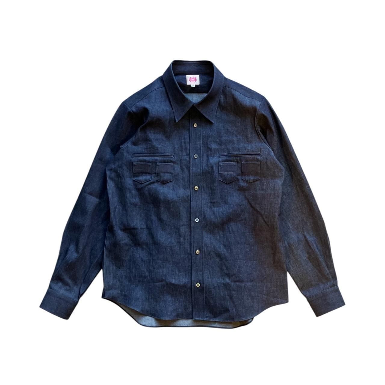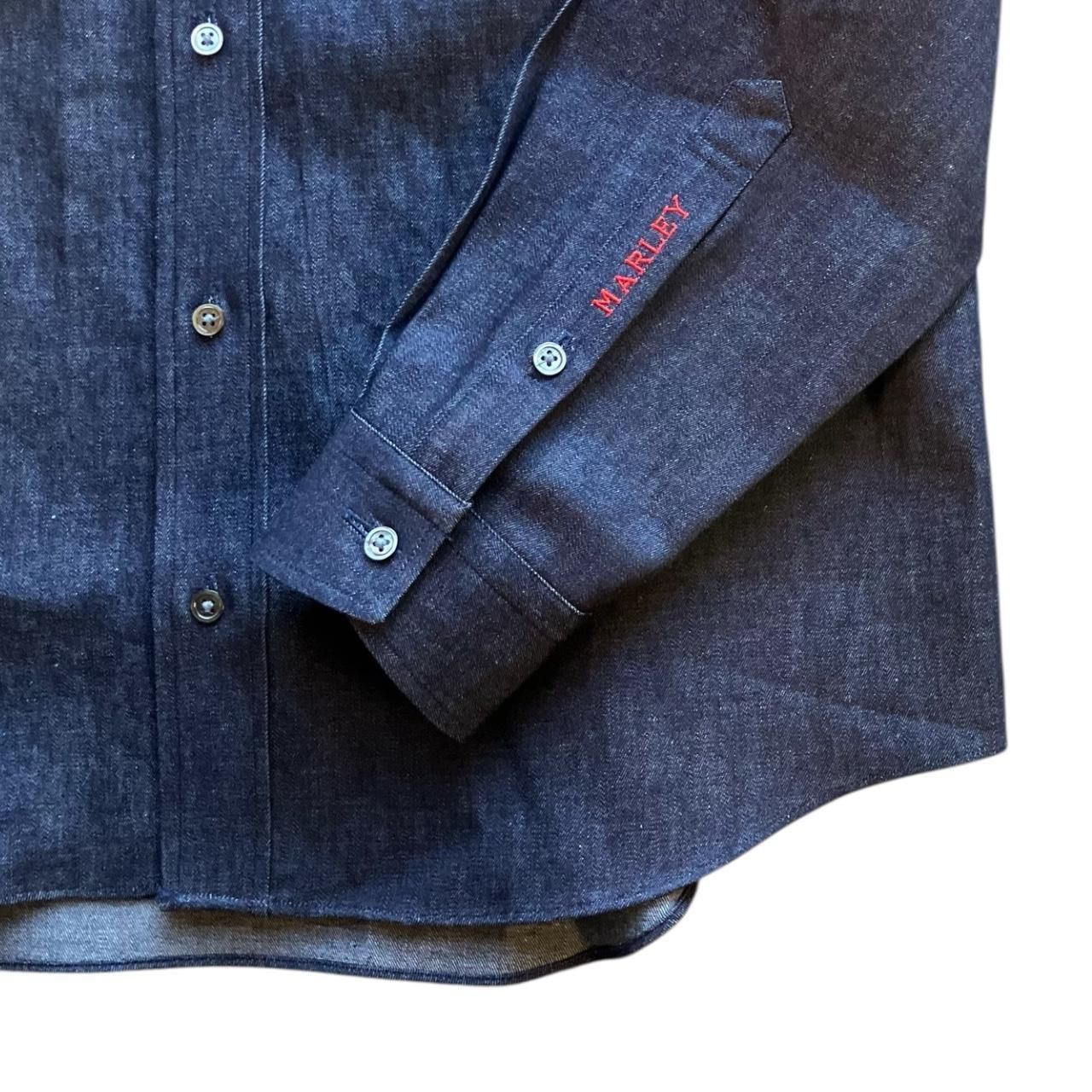 このシャツのモデルはカリブ海ジャマイカのあの人だ。 この人は本当によくシャツを着ていて、その姿がいつもカッコいい。他にもモデルにしたいシャツが沢山あるのだが、謎の小さいポケットが4つ付いたシャツをチョイス。ワークシャツのようなテイストもあるし、ドレッシーな雰囲気も漂わせる音楽で政治を動かしたスーパースター。このシャツのモデルはあの人以外考えられない。比較的薄手のデニムを使用しております。 シャツ袋はサイドの糸をほつけば手ぬぐいになります。(袋の色やデザインはランダムです)